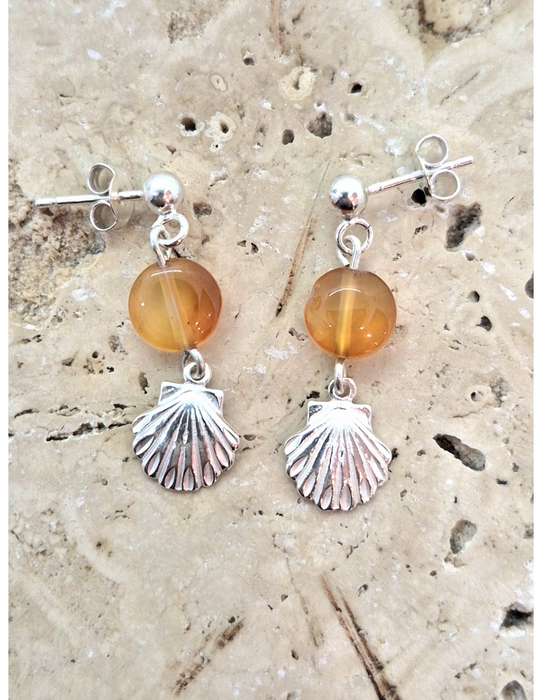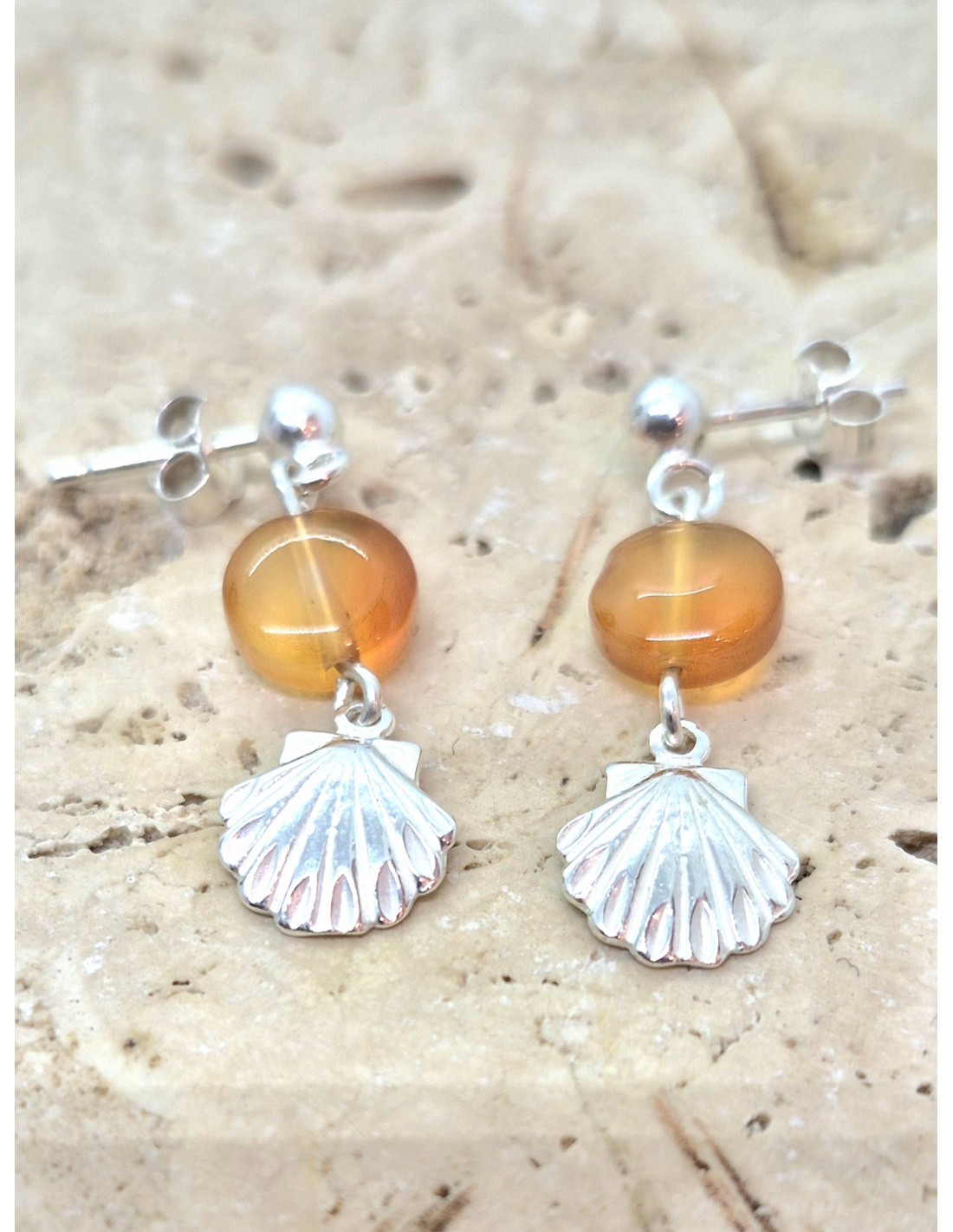 Boucles d'Oreilles en Cornaline et sa coquille St Jacques en argent 925